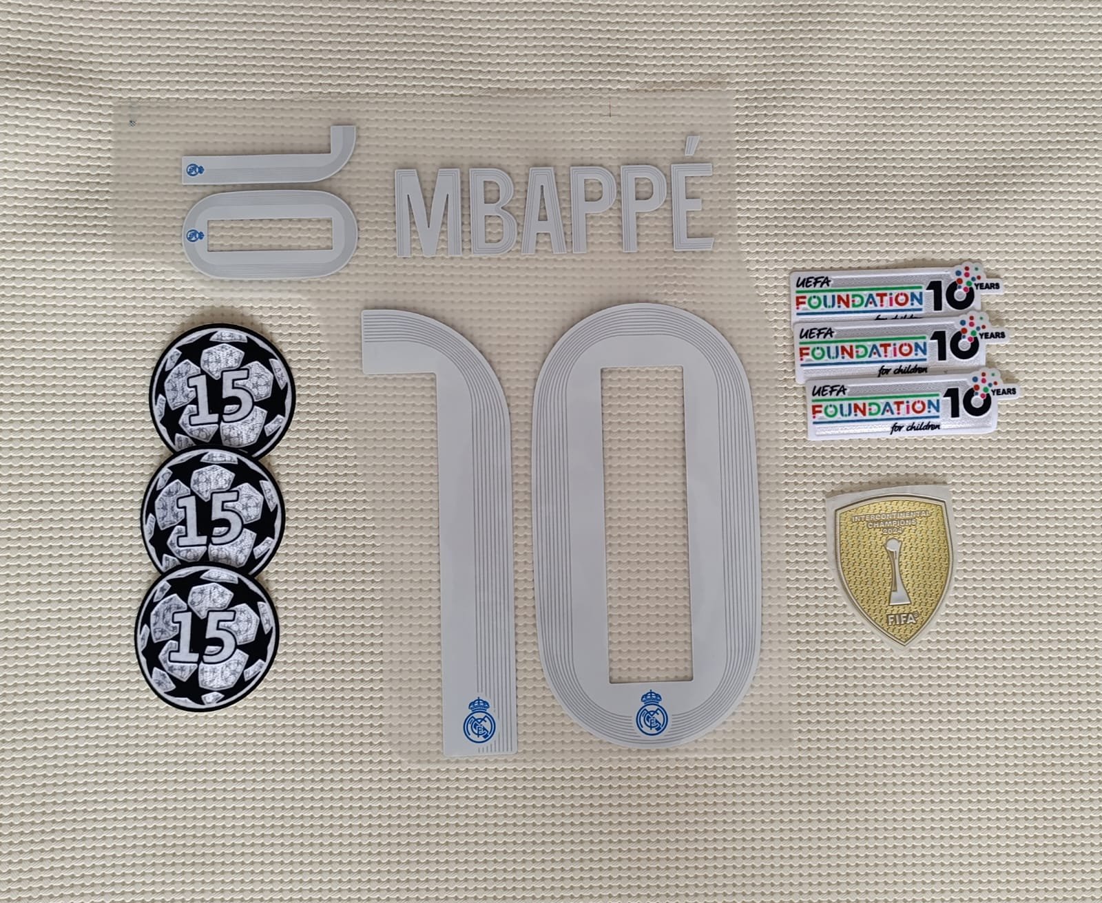Set Real Madrid Mbappe alternativa Kit 2025 UCL dorsal+ 3 parches. cantidad