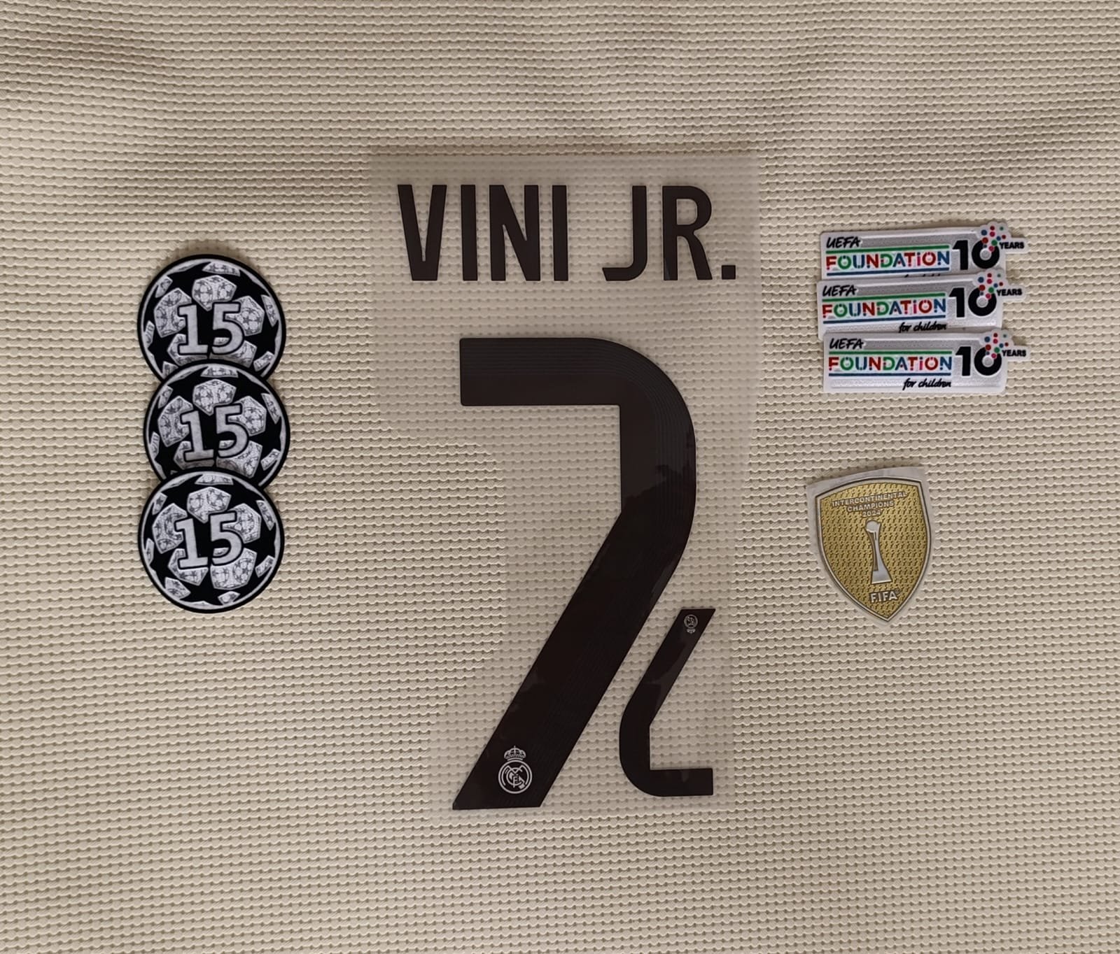 Set Real Madrid Vini JR local Kit 2025 UCL dorsal+ 3 parches cantidad