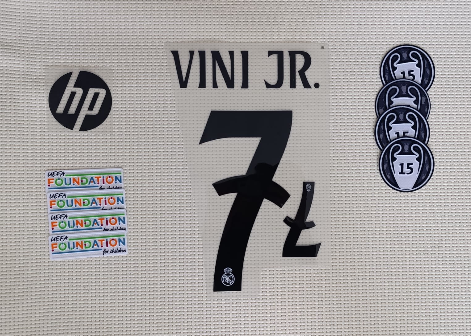Set Real Madrid Vini JR local UCL 2024 dorsal+3 parches cantidad